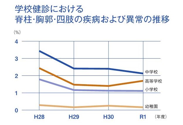 A:令和元年度学校保健統計調査によると、平成28年からの学校健診で判明した脊柱・胸郭及び四肢の疾病及び異常の割合は、骨格の成長の著しい中学生に最も多く見られました()。令和元年では、幼稚園0.16%、小学校1.13%、中学校2.12%、高等学校1.69%であり、運動器検診導入初年度の28年度より少なかったが、運動器検査が未だ的確に実施されていない実態があり、さらに精度の信頼性を高める必要があります。現在、在学者数に換算すると全国で約24万人の児童生徒が何らかの運動器疾患・障害を患っていることになり、早急に改善しなければなりません。
