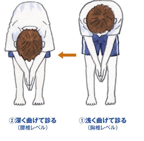 A:前屈テストが有効です。前屈した時の背中の状態を診るときに、ゆっくりと、①浅く曲げて診る ②深く曲げて診るの2通りをチェックすることが重要です。①の場合は、胸椎レベル、②の場合は腰椎レベルの弯曲をチェックします。