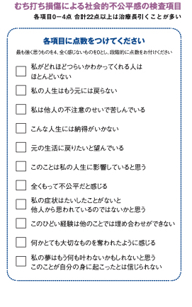 昔は頚椎カラーやマッサージ、ブロックなどを行っていましたが、最新の国際的に推奨される治療法は、診察にて神経損傷が無ければ、仕事や日常生活にすぐに戻ることが早く治る秘訣です(表1)。運動療法は効果あるとされており、鎮痛剤の内服は数日までの短期間で終了するほうが良いとされています。追突されたら加害者に腹が立つと思います。しかしあまり怒ると余計に痛みが増えてしまう原因になることが調査で判明しているのでもし(表2)のような気持ちが大きいなら少し気持ちを切り替えるほうが自分のためになります。事故は避けることができれば良いのですが、大型車両に追突されたり、またバイクが自動車に追突したり様々です。しかし、大型車両がぶつかっても、バイクのような軽いものが追突しても治療期間は変わりませんでした。つまり日本での「むち打ち」の怪我は身体の怪我ではなくて、むしろ心の怪我と考えてはいかがでしょうか?起きてしまったことは仕方がありませんので、前を向いて日常生活を過ごしていきましょう。