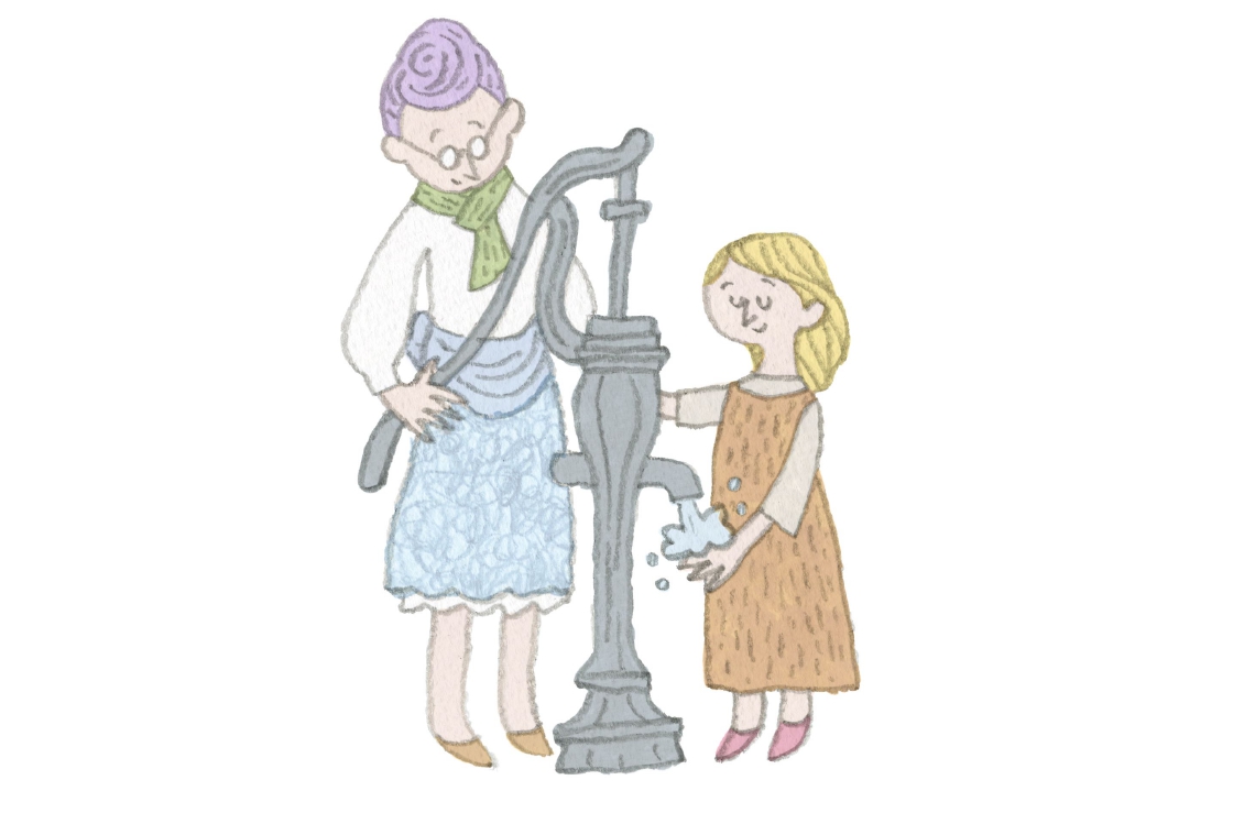 アニー・サリバンは、ヘレン・ケラーの片手に井戸水のポンプで汲んだ冷たい水をゆっくりとかけ、それからもう片方の手に素早く“w-a-t-e-r”と綴ります。その指の動きに全神経を傾けていたヘレンに突然、「言葉の神秘の扉」が開かれます1,2)。彼女は、“Wa-.”, “Wa-.”、と叫びながら、その水の感触を確かめるように何度も何度もポンプで水を汲むのでした1,2)。