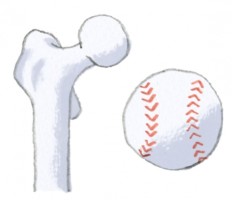 股関節の特徴は、専門的には「球関節」といわれる形にあります。野球の球と同じ意味で、まん丸という言う意味です。球関節の代表は、肩関節と股関節です(図1)。どちらも、真ん丸の関節ですので動く範囲がとても広くなっています。また、股関節は立っている・歩いているときにとても大きな重みがかかります。歩いているときは、体重の3~4倍の重さが股関節にかかります。そのため股関節は、軽微な障害でも強い痛みと動きの制限が生じやすくなっています。