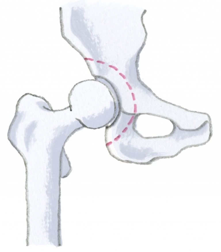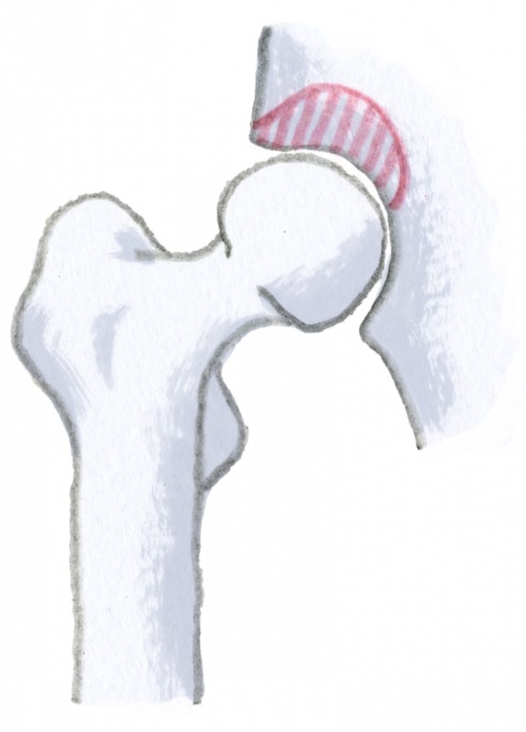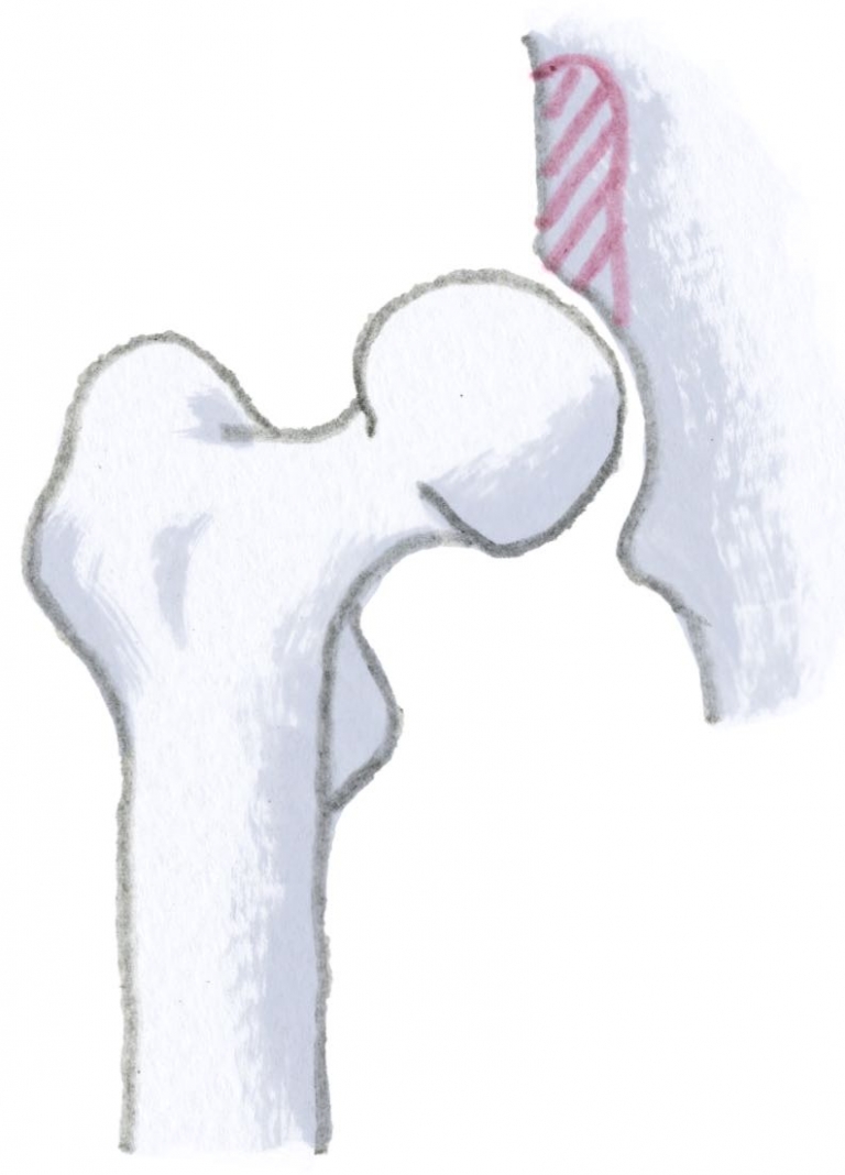 次に手術です。手術は主なものとして3種類あります。股関節鏡(内視鏡による手術)、骨切り術(骨の形を変える手術)(図3)、人工股関節です。術式は変形の程度と、患者さんの年齢・生活様式で選択されます。股関節鏡と骨切り術は、自分の関節を温存できる手術ですが、適応となる変形の程度、年齢などが限られていますのでそのタイミングを逃さないようにすることが大切です。