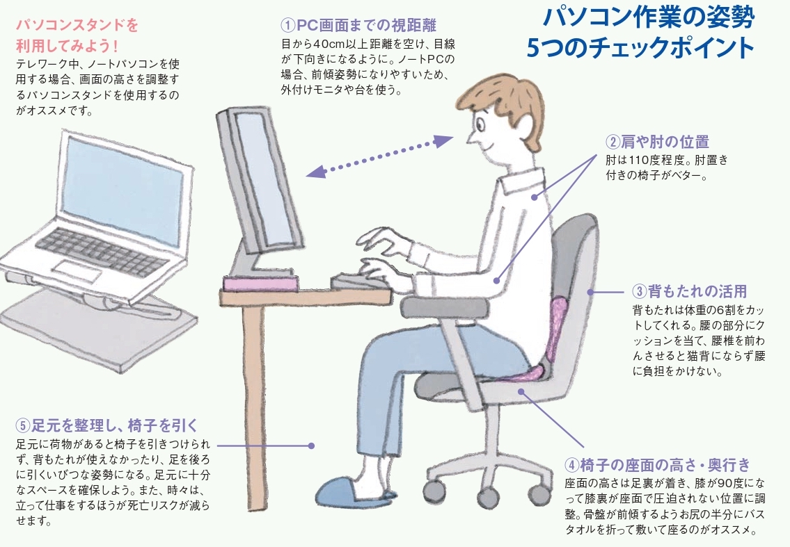詳しくはイラスト(上図)を見てほしいのだが、デスクワークの場合は、バスタオルを活用するのがオススメ。椅子に深く腰掛け、座面の奥に折ったバスタオルを敷いてお尻を半分のせると骨盤が前傾気味に立つ。また、背もたれの腰の部分にクッションを設置することで、背中が丸まらず、正しい姿勢を維持できる。