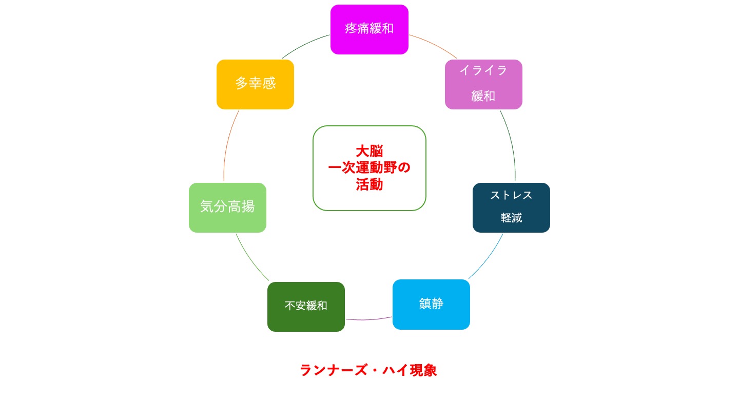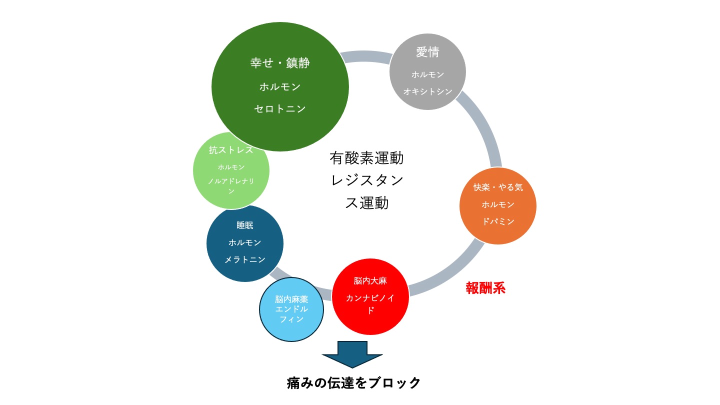 慢性疼痛に対しては薬や注射などの治療もありますが、国際的なガイドライン(治療の指針)では運動療法が第一選択の治療法として推奨されています。運動は単に筋肉や関節を強くするだけでなく、脳内で「痛みを和らげる物質(エンドルフィンやエンドカンナビノイド、ドパミンなど)」を分泌し、痛みの神経回路を整える(痛みを抑え込む)作用があることがわかっています。これは「運動誘発性鎮痛」と呼ばれ、“ランナーズ・ハイ”として知られる現象で、誰にでも起こり得る防御反応として科学的に証明されています。