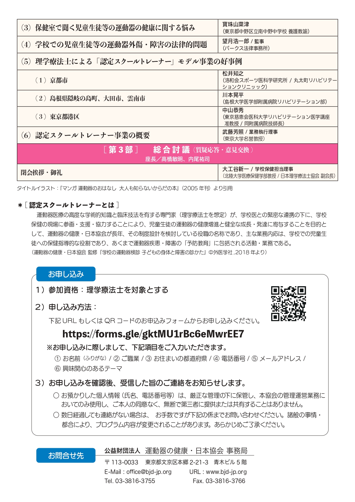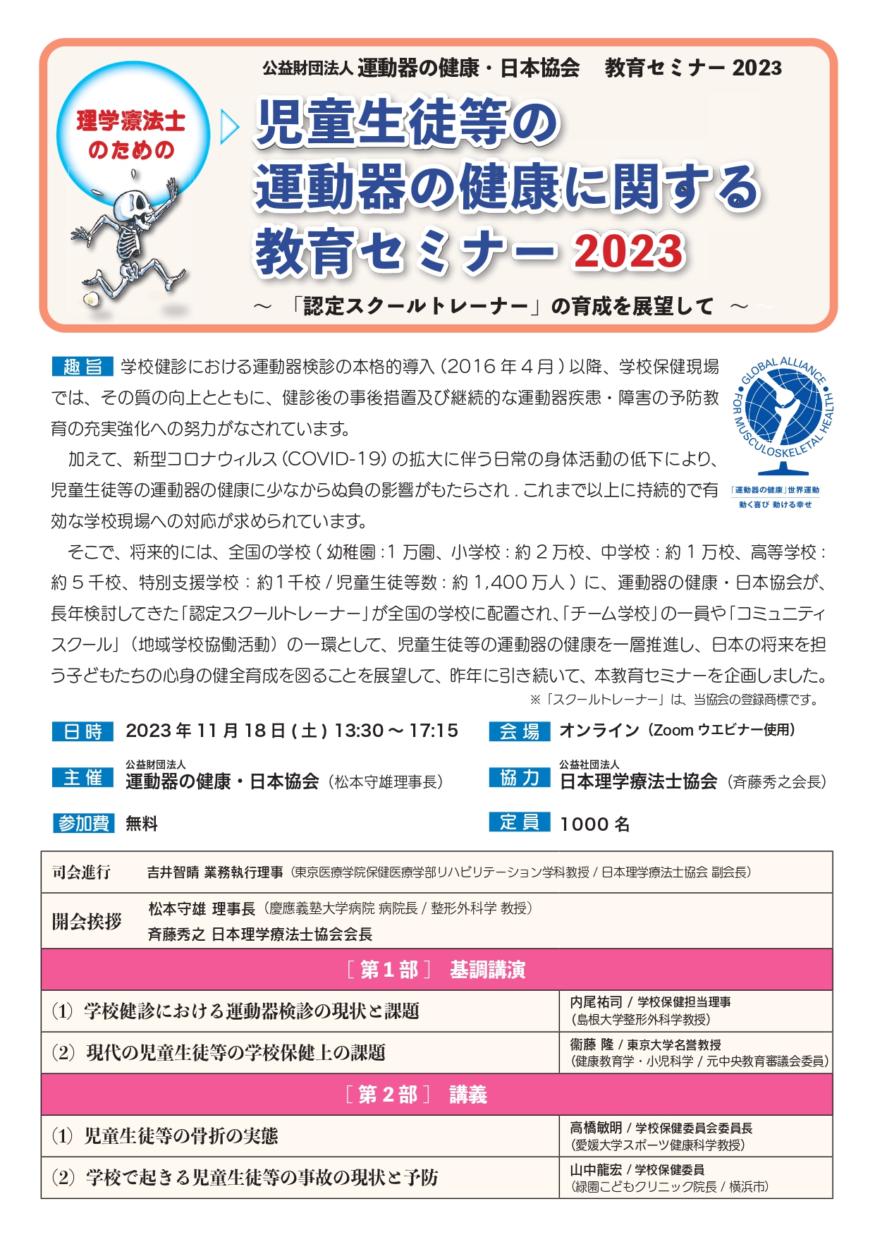 公益財団法人運動器の健康・日本協会は、昨年11月12日に開催した「理学療法士のための児童生徒等の運動器の健康に関する教育セミナー」の第2段として、「児童生徒等の運動器の健康に関する教育セミナー2023」〜『スクールトレーナー」の育成を展望して〜を開催します。
