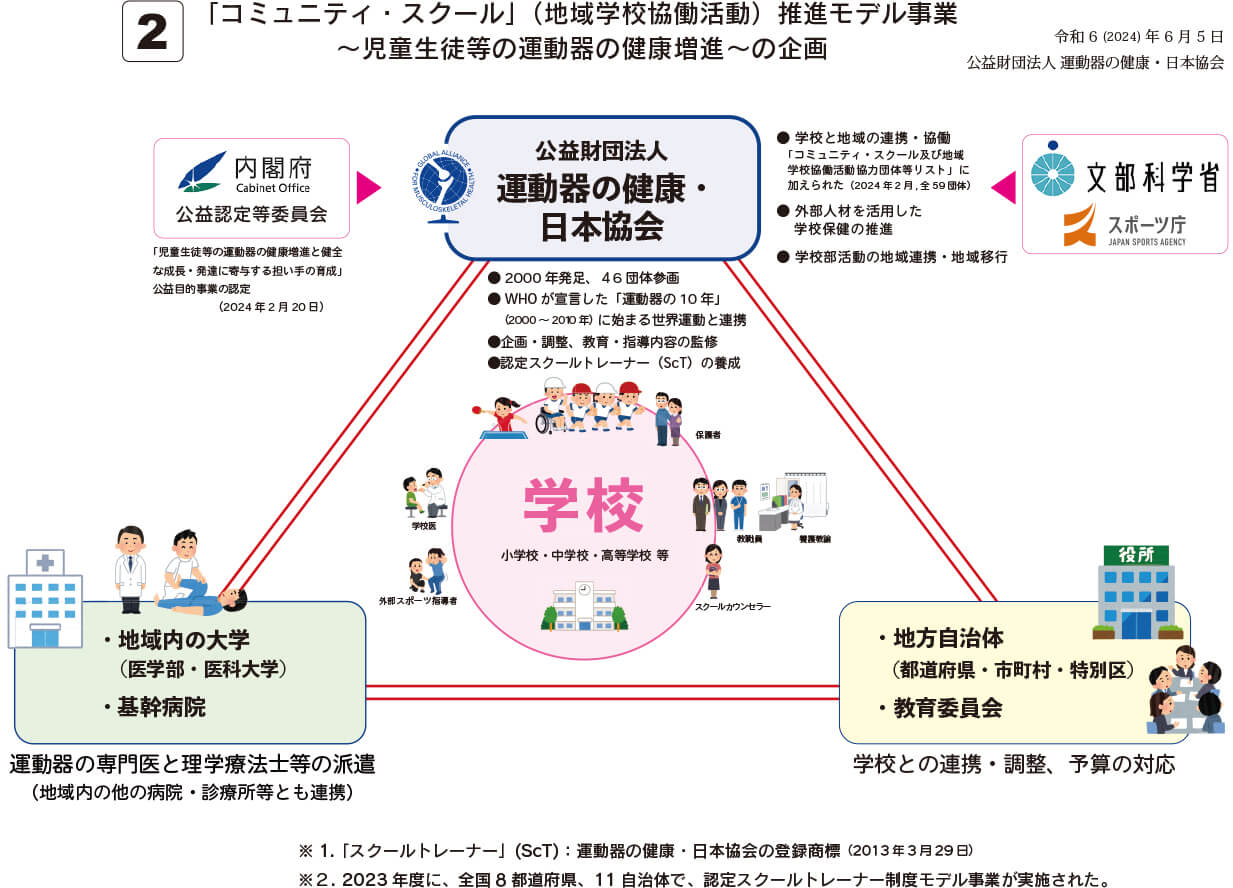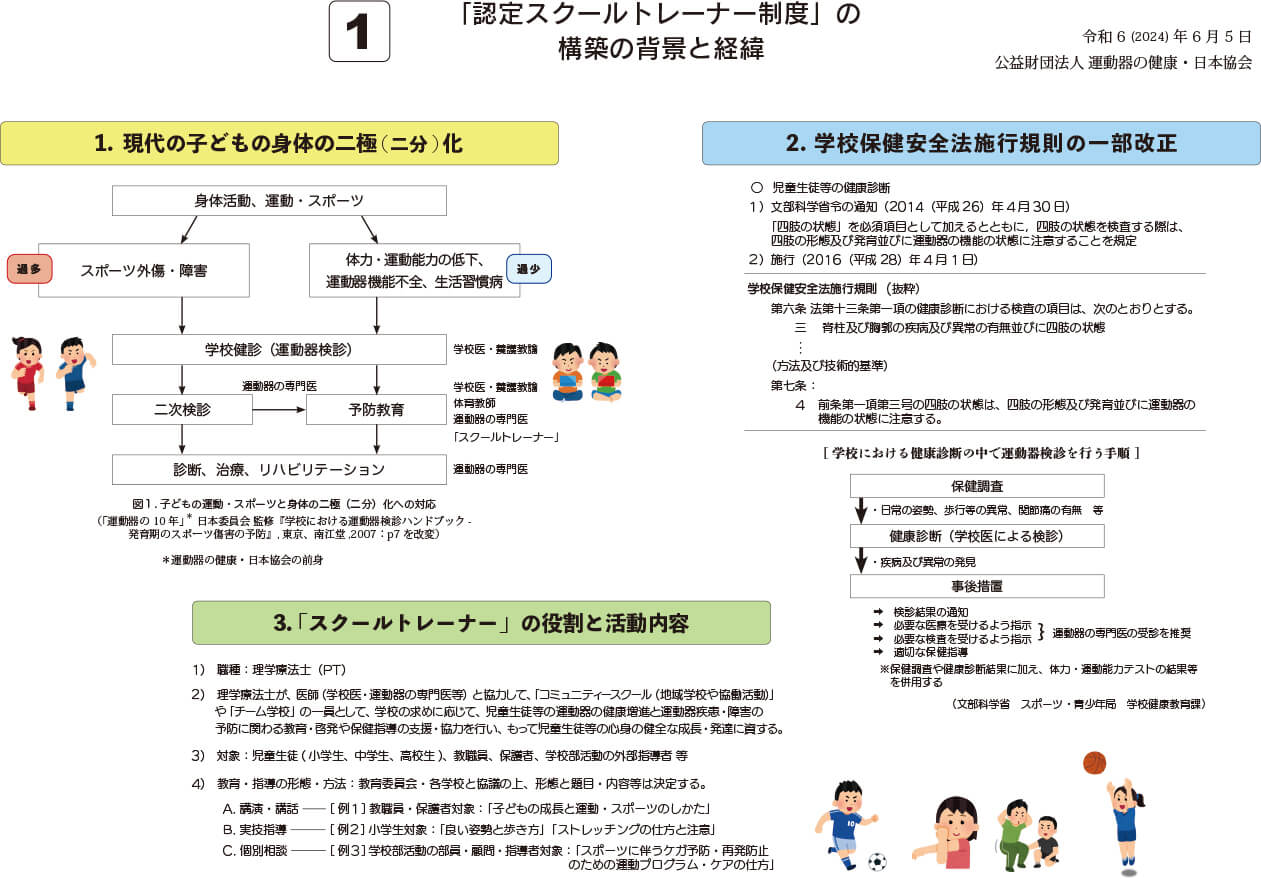 理学療法士が学校での児童生徒等に対して保健指導的な役割を果たし、運動器疾患・障害の予防教育を実施し、もって児童生徒等の運動器の健康を推進すると共に、心身の健全な成長、発達に資することを目指して、継続的に有効なシステムとして機能するために、「認定スクールトレーナー制度」を構築準備中です。この制度は、公益財団法人「運動器の健康・日本協会」が、内閣府や文部科学省と連携を図りながら、外部人材を活用した学校保健を推進し、コミュニティスクールとしての地域と学校の協働や学校運動部活動の地域移行などを踏まえたうえで実施します。